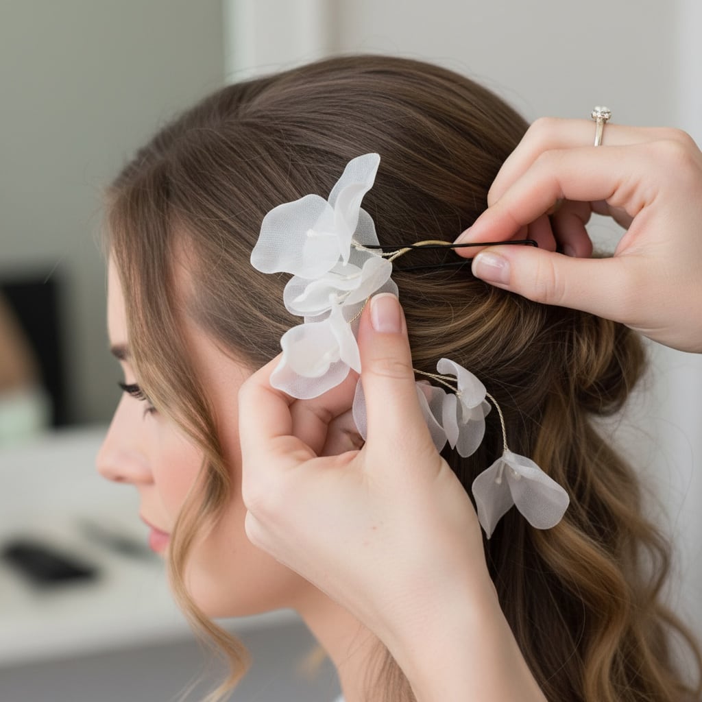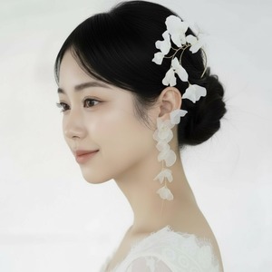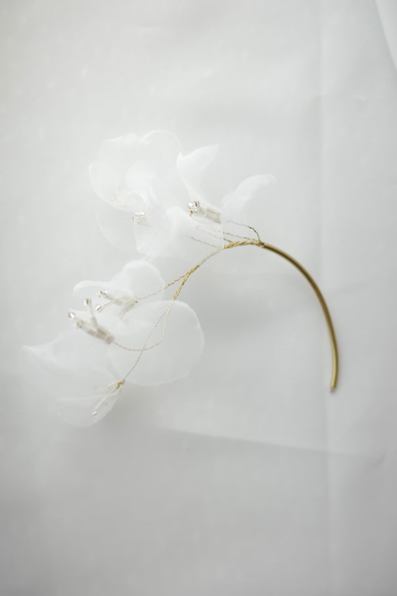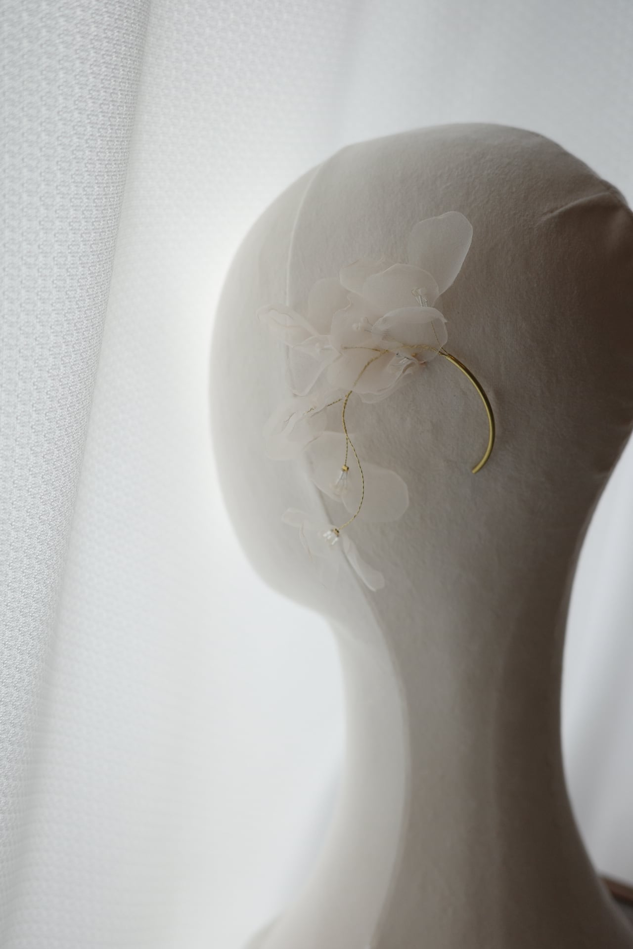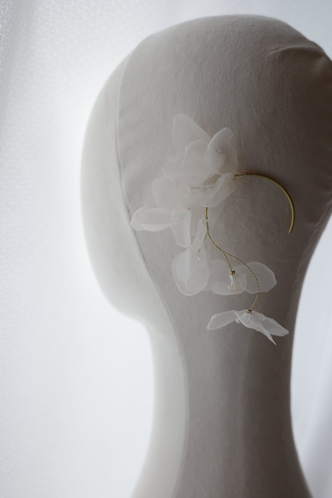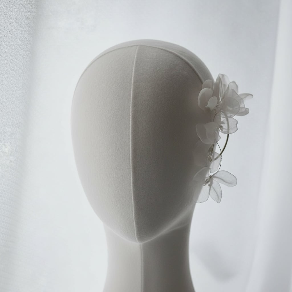 透明感のある花びらがそっと髪に寄り添う髪飾り。